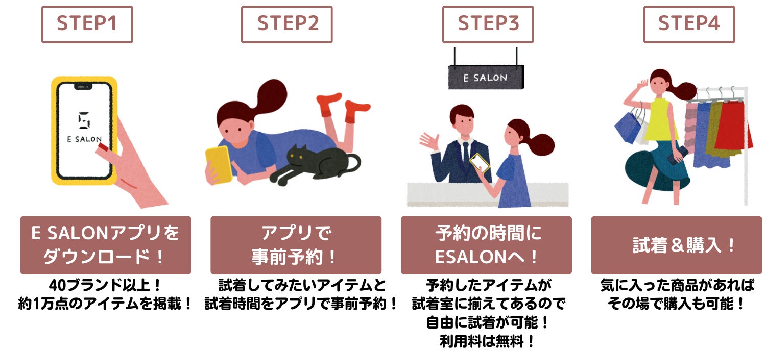 E SALONスタッフが、ご希望のアイテムを「E SALON」試着室にご用意しており、ブランドの垣根を越えたフィッティングを自由にお楽しみいただけます。(※利用料無料)